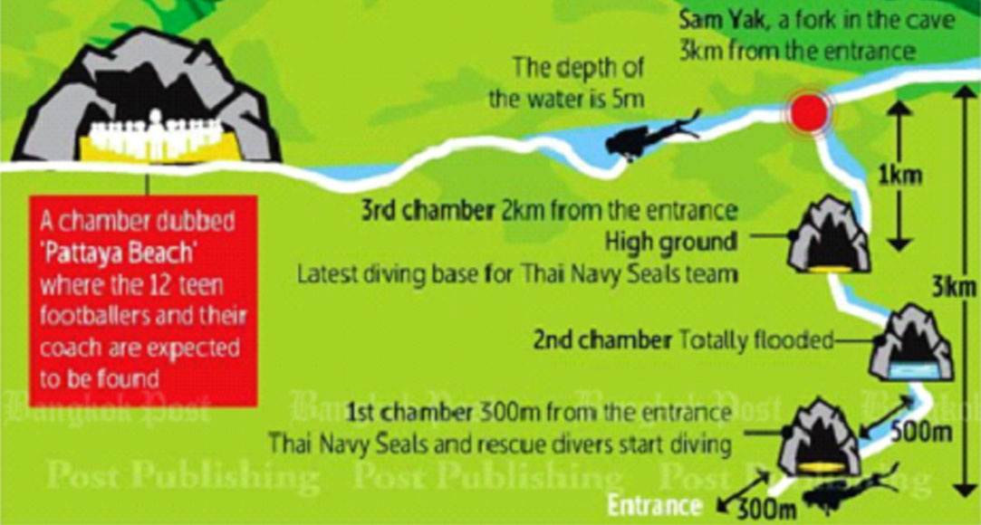 តាមប្រភពព័ត៌មានបាងកកប៉ុស្ត៍ ចេញផ្សាយមុននេះ បានឱ្យដឹងថា បេសកកម្មរុករកក្រុមកីឡាករបាល់ទាត់ និងគ្រូបង្វឹកទាំង១៣នាក់ ដែលបាត់ខ្លួនតាំងពីថ្ងៃសៅរ៍ សប្តាហ៍មុននោះ បានរំកិលជិតទៅដល់ទីតាំងល្អាងភ្នំធំ ដែលគេដាក់រហស្សនាមថា សមុទ្របាតាយ៉ា (Pattaya Beach)។ គិតត្រឹមល្ងាចថ្ងៃចន្ទ នេះ នៅសល់តែចម្ងាយជាង៥០០ម៉ែត្រ ខណៈសារព័ត៌មានខ្លះថា ១០០០ម៉ែត្រទៀត ក្រុមជួយសង្គ្រោះ ជំនាញមុជទឹក នឹងទៅទីនេះហើយ។