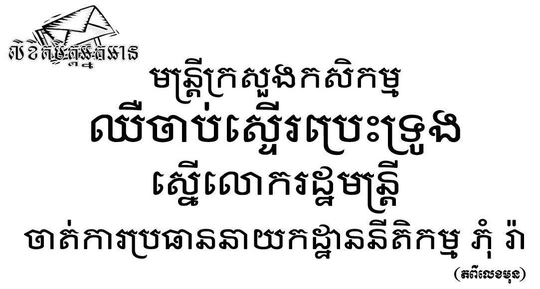២-ស្នើសុំឯកឧត្តមរដ្ឋមន្ត្រី មេត្តាពិនិត្យពិចារណា និងមានវិធានការសមស្រប ចំពោះលោកភុំ រ៉ា ប្រធាននាយកដ្ឋាននីតិកម្ម កសិកម្ម មិនមានបុគ្គលិកលក្ខណៈជាបក្ខជន មហាជន ដែលតែងតែធ្វើឱ្យបែកបាក់សាមគ្គីភាពមូលដ្ឋាន និងបាត់បង់ប្រជាប្រិយភាព ព្រមទាំងការធ្លាក់ចុះនូវសមាជិកភាពនៅមូលដ្ឋាន ដែលអាចនឹងប៉ះពាល់យ៉ាងធ្ងន់ដល់លទ្ធផលបោះឆ្នោត ខែកក្កដា ឆ្នាំ២០១៨ ខាងមុខទៀត ដែលដើរបញ្ច្រាសទៅនឹងការអនុវត្តផែនការ និងយុទ្ធសាស្ត្រដើម្បីពង្រឹងនិងពង្រីកសមាជិកឡើងវិញ ស្របតាមគោលនយោបាយរបស់គណបក្សប្រជាជនកម្ពុជា និងតាមការណែនាំរបស់ឯកឧត្តមរដ្ឋមន្ត្រី។