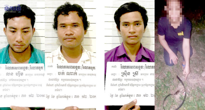 សមត្ថកិច្ចមូលដ្ឋាន បានបញ្ជាក់ថា ខណៈដែលកម្លាំងចេញល្បាតក្នុងភូមិសាស្ត្រខាងលើ ស្រាប់តែបានជួបនារីរងគ្រោះរត់មកប្តឹងថានាង ត្រូវគេចាប់រំលោភបូក ដោយបាននាំសមត្ថកិច្ចទៅចង្អុលទីតាំងកើតហេតុ និងឃើញវត្ថុតាង ស្រោមអនាម័យប្រើរួច១ ព្រមទាំងខ្សែក្រវាត់ពណ៌ ខ្មៅចំនួន១ទៀតផង។ បន្ទាប់មកនារីរងគ្រោះ បាននាំសមត្ថកិច្ចទៅចង្អុលមុខក្រុមជនសង្ស័យ ដែលកំពុងនៅក្នុងរោងបុណ្យសពអ្នកភូមិក្បែរនោះ រួចក៏ឈានដល់ការឃាត់ខ្លួននាំយកទៅសាកសួរតែម្តង។