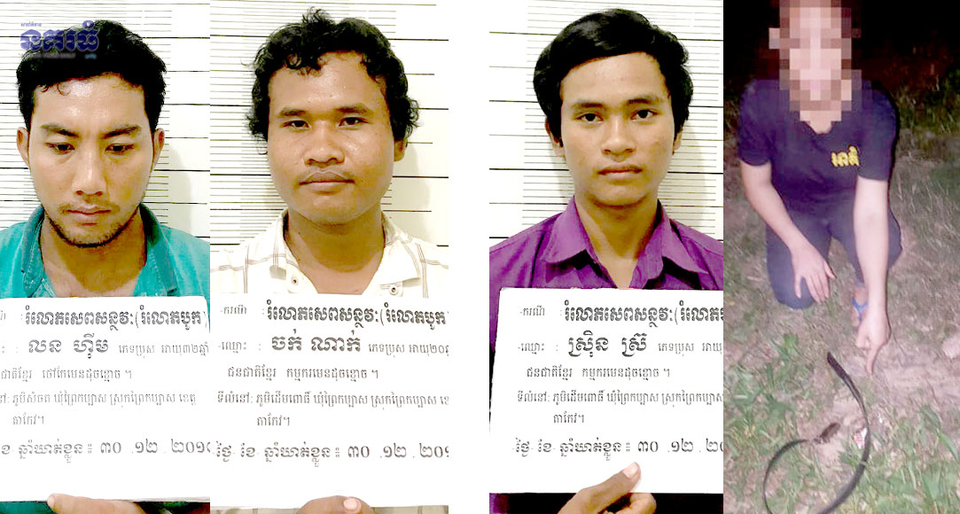 នារីរងគ្រោះដែលត្រូវប្រុសព្រាន៣នាក់ ចាប់រំលោភបូក មានអាយុ២០ឆ្នាំ មុខរបរនៅផ្ទះ មានលំនៅក្នុងខេត្តកណ្តាល។ ចំណែក ជនសង្ស័យល្មោភកាមទាំង៣នាក់ រួមមាន ទី១-ឈ្មោះលន ហ៊ីម អាយុ៣២ឆ្នាំ មុខរបរថៅកែមេនដុតខ្មោច មានលំនៅភូមិសំចត ឃុំព្រៃកប្បាស ស្រុកព្រៃកប្បាស ខេត្តតាកែវ ទី២-ឈ្មោះស៊្រិន ស៊្រ អាយុ១៨ឆ្នាំ មុខរបរកម្មករមេនដុតខ្មោច មានលំនៅភូមិដើមពោធិ៍ ឃុំព្រៃកប្បាស ស្រុកព្រៃកប្បាស ខេត្តតាកែវ និងទី៣-ឈ្មោះចក់ ណាក់ អាយុ២០ឆ្នាំ មុខរបរកម្មករមេនដុតខ្មោច មានលំនៅភូមិដើមពោធិ៍ ឃុំព្រៃកប្បាស ស្រុកព្រៃកប្បាស ខេត្តតាកែវ។