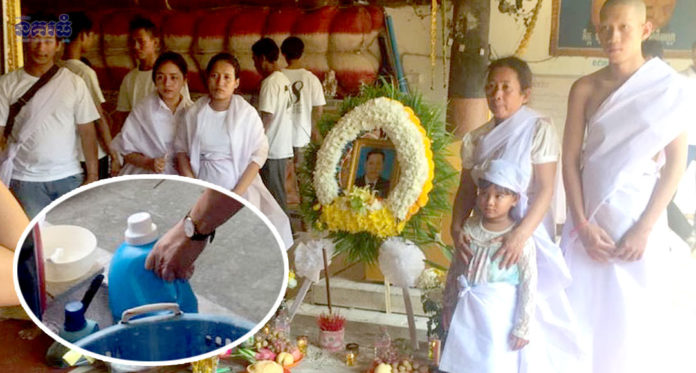 បុរសរងគ្រោះដែលច្រឡំផឹកទឹកថ្នាំកាត់ច្រែះ ស្មានថាជាទឹក បណ្តាលឱ្យស្លាប់យ៉ាងអាណោចអាធ័មខាងលើនេះ មានឈ្មោះអៀង សុខាន់ អាយុ៥៣ឆ្នាំ មានលំនៅផ្ទះលេខ២៥៤ ភូមិព្រែកឫស្សី សង្កាត់ព្រែកឫស្សី ក្រុងតាខ្មៅ ខេត្តកណ្តាល។
