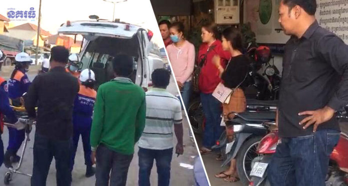 តាមប្រភពពីកម្មកររួមការងារជាមួយគ្នា បានឱ្យដឹងថា នៅមុនពេលកើតហេតុ ខណៈដែលស្ត្រីរងគ្រោះកំពុងតែធ្វើការងារសុខៗ ស្រាប់តែកើតមានអាការទន់ដៃជើង ងងឹតវិលមុខដួល តែសំណាងល្អ ភ្លាមៗនោះ ត្រូវបានកម្មករកំពុងឈរក្បែរនោះ ប្រទះឃើញស្ទុះទៅចាប់ត្រកងជាប់ ទើបមិនដួល ហើយត្រូវបានកម្មកររួមការងារ ដឹកយកទៅផ្ទះពេទ្យគ្លីនិកឯកជន តែគេមិនហ៊ានទទួល ដោយជំងឺធ្ងន់ធ្ងរត្រូវបានក្រុមគ្រួសារ ហៅរករថយន្តសង្គ្រោះរបស់អង្គភាព៧១១ ដឹកបញ្ជូនទៅមន្ទីរពេទ្យកាល់ម៉ែត។