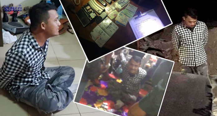តាមប្រភពពីសមត្ថកិច្ចបានឱ្យដឹងថា បន្ទាប់ពីទទួលបានសេចក្តីរាយការណ៍យ៉ាងច្បាស់លាស់ពីសំណាក់បណ្តាញសម្ងាត់ សមត្ថកិច្ចក៏កំណត់មុខសញ្ញាជនសង្ស័យជួញដូរថ្នាំញៀនបានម្នាក់ ដោយជននោះគឺជាមន្ត្រីយោធាទៀតផង។ បន្ទាប់មក កម្លាំងជំនាញ ក៏ឈានដល់ការចុះបង្ក្រាបឃាត់ខ្លួនជសង្ស័យខាងលើ និងធ្វើការឆែកឆេរដល់ក្នុងបន្ទប់ស្នាក់នៅរបស់ជនសង្ស័យ ដកហូតបានវត្ថុតាងមួយចំនួន រួមមាន ម្សៅក្រាម ពណ៌សថ្លា សង្ស័យថាសារធាតុញៀន ចំនួន០២កញ្ចប់ ទូរស័ព្ទដៃ១គ្រឿង អាវុធខ្លី១ដើម មានបង់២ និងគ្រាប់ចំនួន១ បង់កាំភ្លើងវែង (អឹមសី) ចំនួន១ដើម និងគ្រាប់មួយចំនួន ព្រមទាំងរថយន្ត១គ្រឿងទៀតផង។